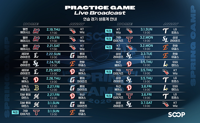 SOOP이 프로야구 구단들의 스프링캠프 연습경기 중계에 나선다. ㈜SOOP(각자 대표이사 서수길, 최영우)은…