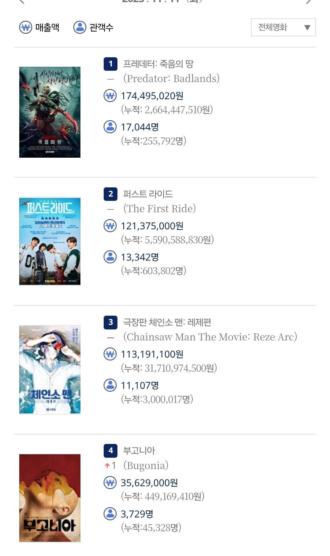 반박불가... 올해 극장가 최고 이변 작성자 정보 백마탄환자 작성 작성일 2025.11.12 10:00 컨텐츠 정보 159 조회 목록 관리 글수정 글삭제 본문 체인소맨 레제편 300만 관객 돌파 관련자료 이전 에픽하이 투컷 잡도리하는 강민경 ㅋㅋㅋㅋ 작성일 2025.11.12 10:00 다음 포스터 하나로 불타고 있는 일본 축구 대표팀 상황 작성일 2025.11.12 10:00 댓글 0 등록된 댓글이 없습니다. 로그인한 회원만 댓글 등록이 가능합니다. 목록 관리 글수정 글삭제