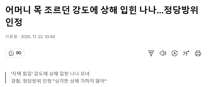 어머니 목 조르던 강도 상해 입힌 나나 근황 작성자 정보 이웃집또털어 작성 작성일 2025.11.22 20:00 컨텐츠 정보 168 조회 목록 관리 글수정 글삭제 본문 https://v.daum.net/v/20251122104448535 관련자료 이전 미용실 아줌마 말 듣고 10억 집 산 조영구 작성일 2025.11.22 20:00 다음 본인이 상위 10퍼센트라고 주장하는 33살 여성의 스펙 작성일 2025.11.22 20:00 댓글 0 등록된 댓글이 없습니다. 로그인한 회원만 댓글 등록이 가능합니다. 목록 관리 글수정 글삭제