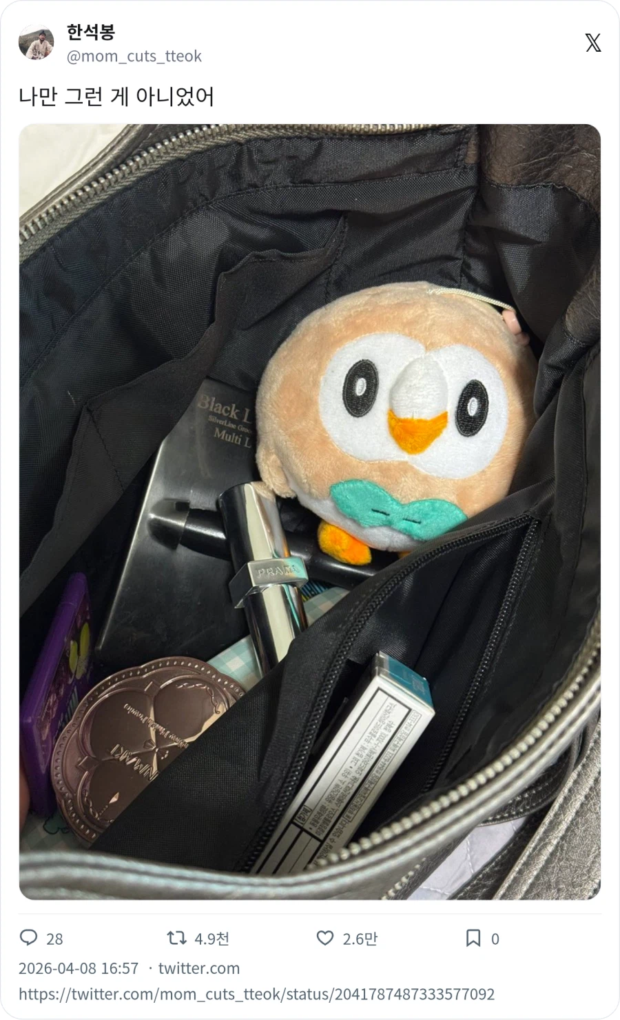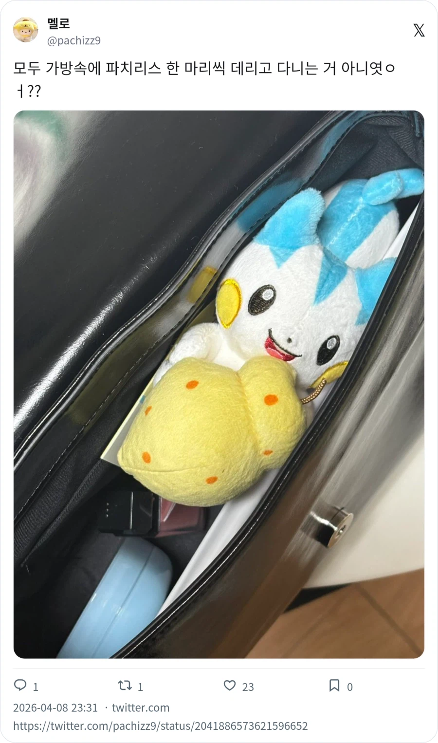 데리고 다니는 반려 포켓몬 작성자 정보 오드리될뻔 작성 작성일 2026.04.09 16:00 컨텐츠 정보 141 조회 목록 관리 글수정 글삭제 본문 ? 관련자료 이전 왕사남 단종 사망후 근황 작성일 2026.04.09 16:00 다음 멤버랑 팬이 다 웃기다는 여돌.jpg 작성일 2026.04.09 16:00 댓글 0 등록된 댓글이 없습니다. 로그인한 회원만 댓글 등록이 가능합니다. 목록 관리 글수정 글삭제