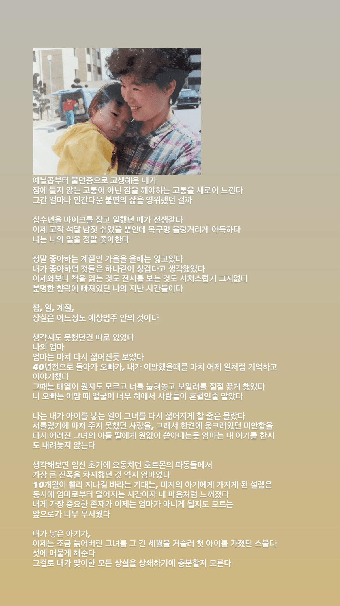이현경, 출산의 순간을 지나며 전한 진심어린 글 작성자 정보 세일러묵 작성 작성일 2025.10.30 16:00 컨텐츠 정보 203 조회 목록 관리 글수정 글삭제 본문 내가 낳은 아기가, 이제는 조금 늙어버린 그녀를 그 긴 세월을 거슬러 첫 아이를 가졌던 스물다섯에 머물게 해준다. 그걸로 내가 맞이한 모든 상실을 상쇄하기에 충분할지 모른다. 관련자료 이전 엔비디아 젠슨황, 오늘 오후 김포공항 입국예정 작성일 2025.10.30 16:00 다음 마키마 vs 레제 고르는 여자아이돌 작성일 2025.10.30 16:00 댓글 0 등록된 댓글이 없습니다. 로그인한 회원만 댓글 등록이 가능합니다. 목록 관리 글수정 글삭제
