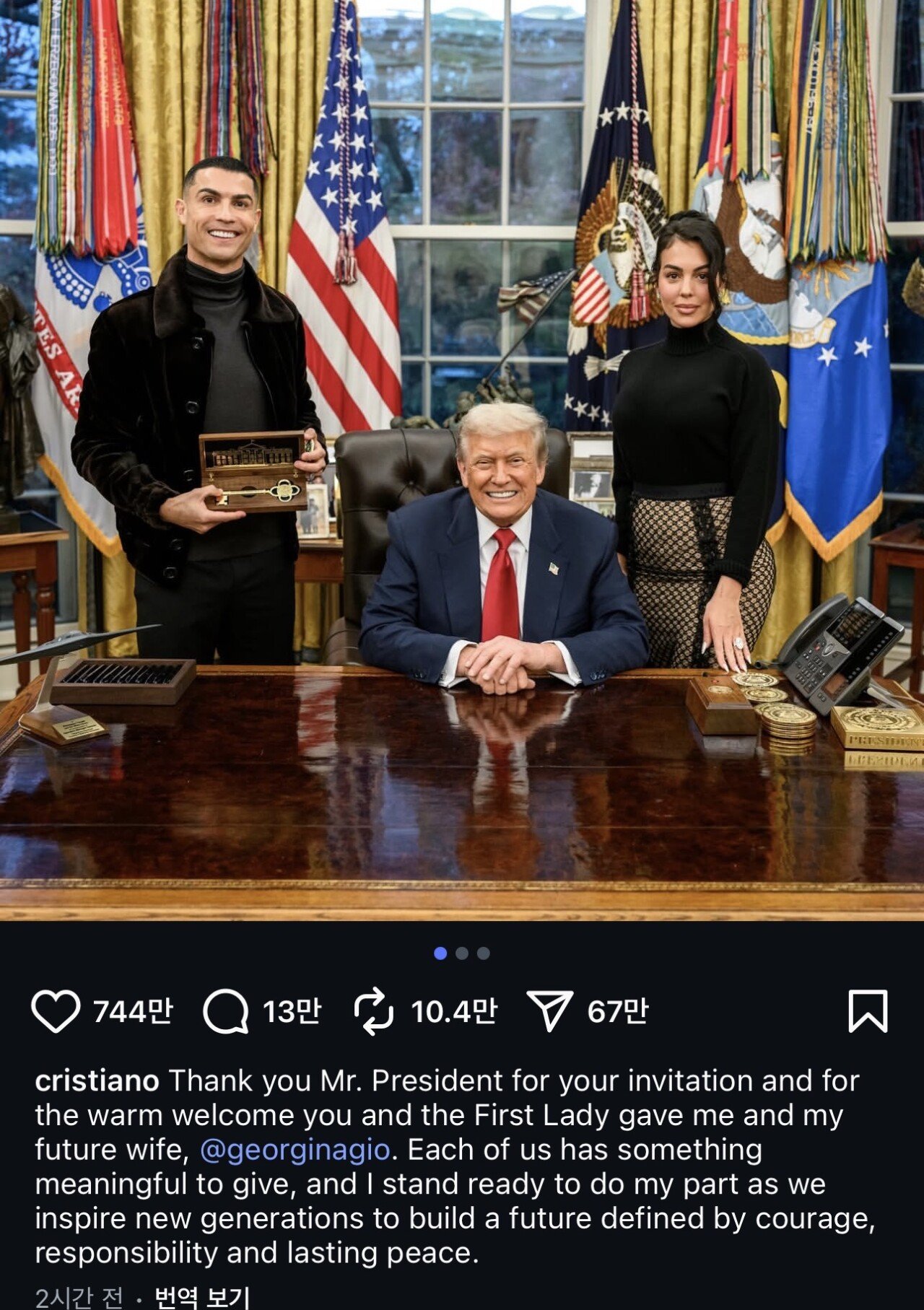 트럼프 : “현재 대학생인 막내아들 배런 트럼프(19)가 호날두의 열렬한 팬이다. 배런이 마침내 전설적인 축구 선수와 직접 마주하게 되었다. 내가 호날두를 소개했다는 사실만으로 배런이 아버지(트럼프 대통령)를 전보다 조금 더 존경하게 되었을 것으로 본다 (농담)”