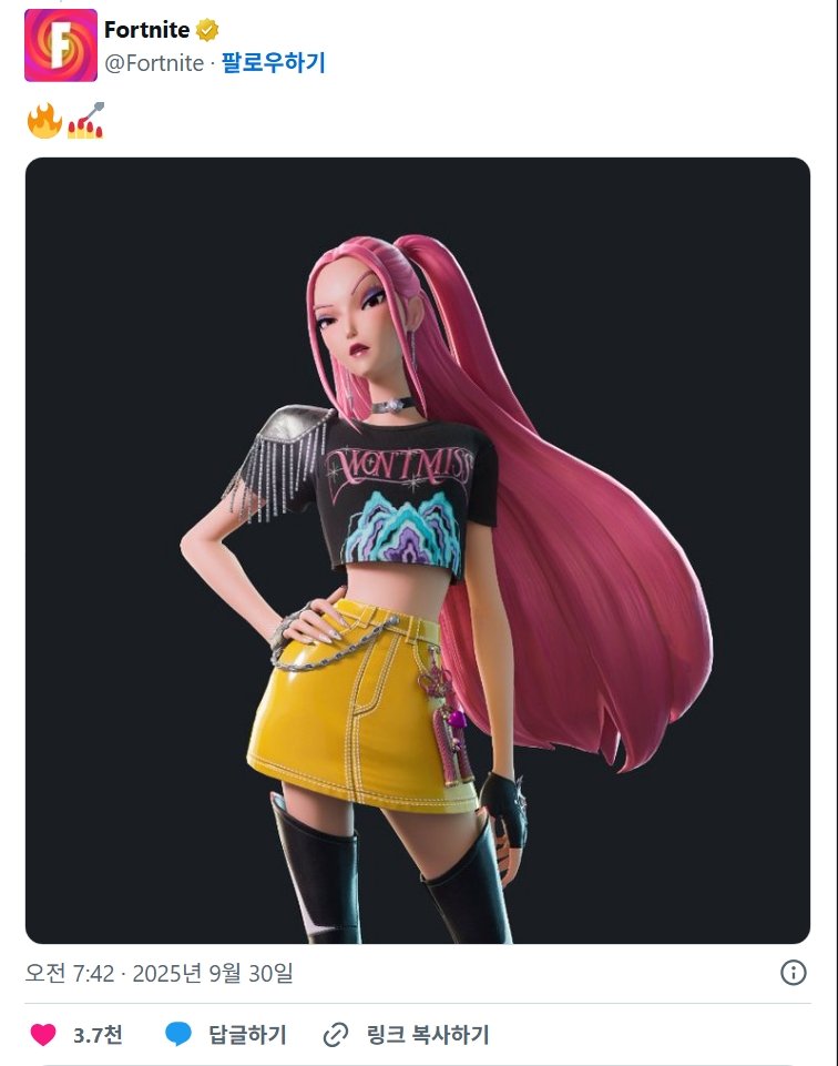 포트나이트 & 케데헌 콜라보 미라 스킨 공개 작성자 정보 처제이리와 작성 작성일 2025.09.30 21:00 컨텐츠 정보 213 조회 목록 관리 글수정 글삭제 본문 포나 공식 트윗에 올라옴. 내일 루미 스킨 기대.. 루머로는 10월 2일인가 3일이 포나 할로윈 이벤트(케데헌 컨텐츠 포함) 시작임 관련자료 이전 캄보디아 조선족들에게 납치당해 강제로 마약하는 한국인 작성일 2025.09.30 21:00 다음 BTS 슈가, 민윤기 치료센터 개원 축사 작성일 2025.09.30 21:00 댓글 0 등록된 댓글이 없습니다. 로그인한 회원만 댓글 등록이 가능합니다. 목록 관리 글수정 글삭제