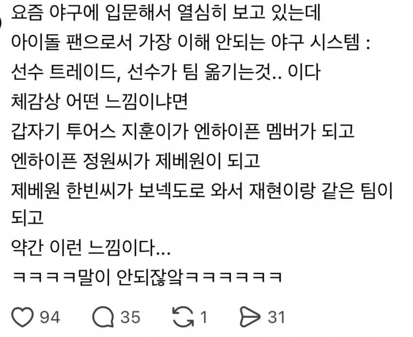 아이돌팬 & 스포츠팬 서로 이해 못하는 지점 작성자 정보 이쑤신장군 작성 작성일 2025.09.24 16:00 컨텐츠 정보 212 조회 목록 관리 글수정 글삭제 본문 아이돌팬: 멤버가 팀을 바꿔? 스포츠팬: 그게 제일 꿀잼컨텐츠 아님? 관련자료 이전 직장인들이 가장 듣고 싶어 하는 말 작성일 2025.09.24 16:00 다음 개그맨 이진호 100km 음주운전 적발 작성일 2025.09.24 16:00 댓글 0 등록된 댓글이 없습니다. 로그인한 회원만 댓글 등록이 가능합니다. 목록 관리 글수정 글삭제