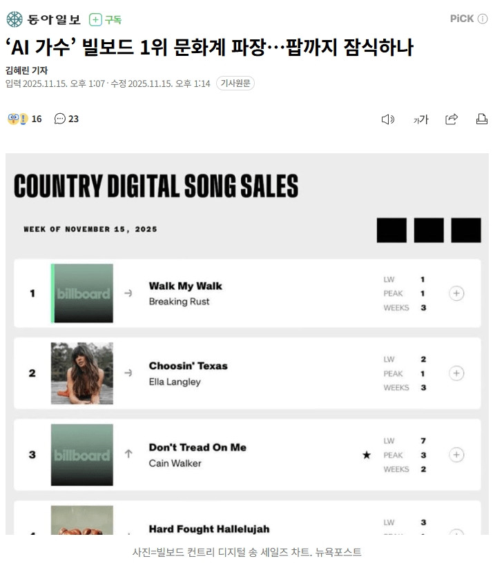 ‘AI 가수’ 빌보드 1위 문화계 파장…팝까지 잠식하나 작성자 정보 F킬라들의수다 작성 작성일 2025.11.16 15:00 컨텐츠 정보 110 조회 목록 관리 글수정 글삭제 본문 ‘AI 가수’ 빌보드 1위 문화계 파장…팝까지 잠식하나|동아일보 전체 1위는 아니고 컨트리 송 차트 1위 해당 곡 미국 신창섭 나옴;; 관련자료 이전 브랜드 창업에 대해 오해하지 말라는 백종원 작성일 2025.11.16 15:00 다음 충격적인 뉴진스 판결문 내용 ㄷㄷ 작성일 2025.11.16 15:00 댓글 0 등록된 댓글이 없습니다. 로그인한 회원만 댓글 등록이 가능합니다. 목록 관리 글수정 글삭제
