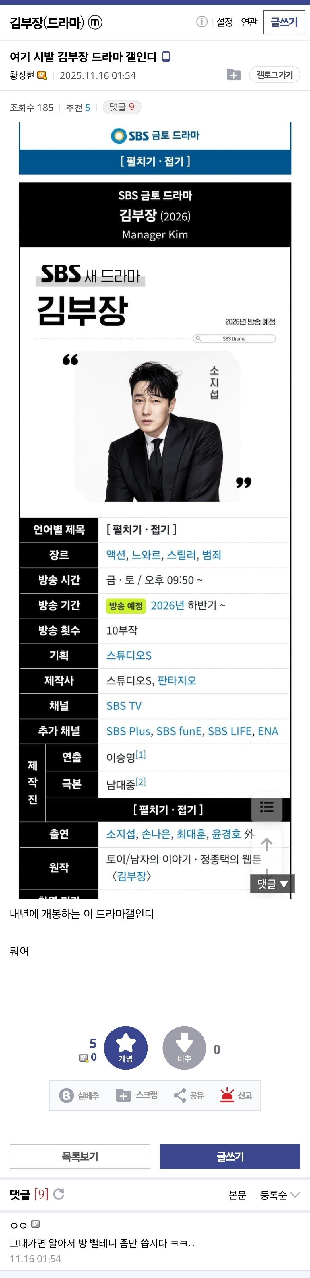 싱글벙글 김부장 갤러리 근황 작성자 정보 넌 강동희였어 작성 작성일 2025.11.16 10:00 컨텐츠 정보 178 조회 목록 관리 글수정 글삭제 본문 내년방영 예정 드라마 갤러리인데 서울 자가에 대기업 다니는 김부장 이야기에 먹힘ㅋㅋ 관련자료 이전 남자 출연자 광기에 할 말 잃은 나는솔로 여성 출연자분 작성일 2025.11.16 10:00 다음 일본한테 야구는 개쳐발라도 치어리더 만큼은 우리가 압승임 작성일 2025.11.16 10:00 댓글 0 등록된 댓글이 없습니다. 로그인한 회원만 댓글 등록이 가능합니다. 목록 관리 글수정 글삭제