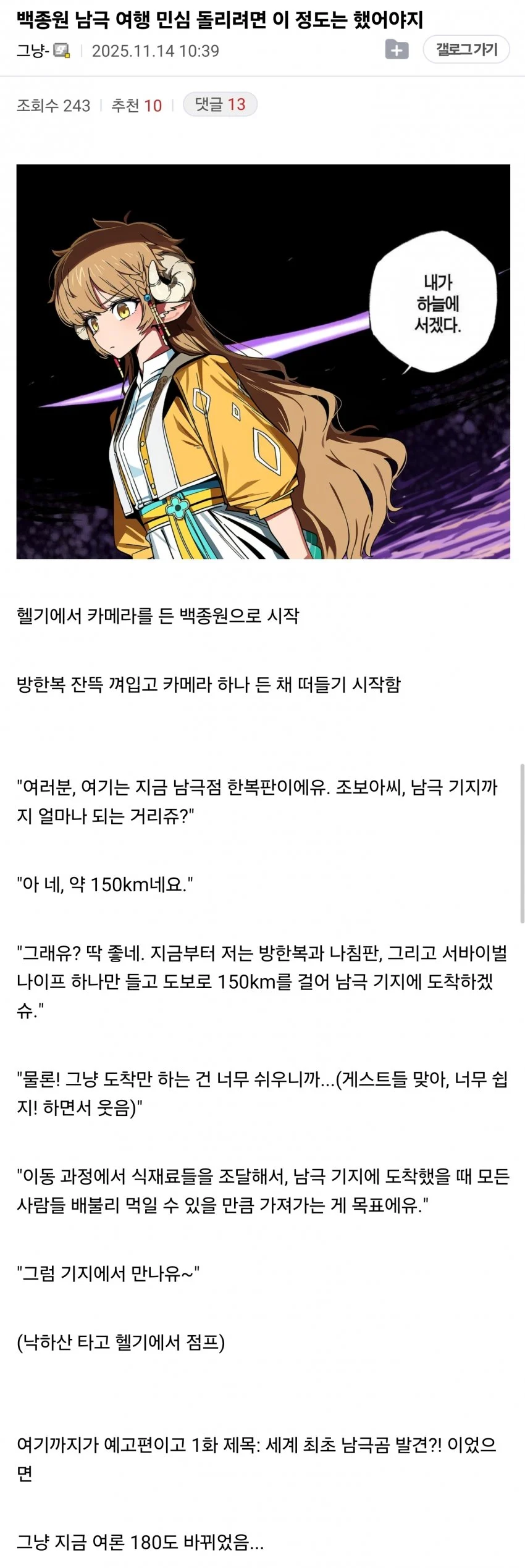 백종원이 남극의 셰프로 민심 잡는법 작성자 정보 전국노예자랑 작성 작성일 2025.11.14 16:00 컨텐츠 정보 133 조회 목록 관리 글수정 글삭제 본문 관련자료 이전 성진국 일본에선 이런 클라스급 애들이 지하아이돌을 하네 작성일 2025.11.14 16:00 다음 공감간다는 고기 구울때 신경쓰이는거 작성일 2025.11.14 16:00 댓글 0 등록된 댓글이 없습니다. 로그인한 회원만 댓글 등록이 가능합니다. 목록 관리 글수정 글삭제
