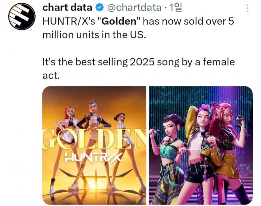 진짜 국뽕.. 케데헌 '골든' 근황 작성자 정보 오드리될뻔 작성 작성일 2025.12.11 11:00 컨텐츠 정보 168 조회 목록 관리 글수정 글삭제 본문 실물 판매,디지털 다운로드,스트리밍을 판매 수치로 환산한 수치를 다 합해서 판매량으로 정하는 방식인데 골든이 5개월 20일 정도의 기간으로 미국에서만 500만장(units)이상이 판매되어서 골든은 2025년 미국에서 가장 많이 판매된 여성 아티스트의 노래라는 기록을 세움 케데헌 ost에 실린 노래들을 합한 월드 와이드 누적 스트리밍 횟수가 100억을 돌파함 미국 연간 기록 1위 세움+케데헌 ost 100억 스트림 돌파 관련자료 이전 고객 눈앞에서 1,500만원 슈킹한 직원 수준 작성일 2025.12.11 11:00 다음 소년 교도소 '13년' 작성일 2025.12.11 11:00 댓글 0 등록된 댓글이 없습니다. 로그인한 회원만 댓글 등록이 가능합니다. 목록 관리 글수정 글삭제