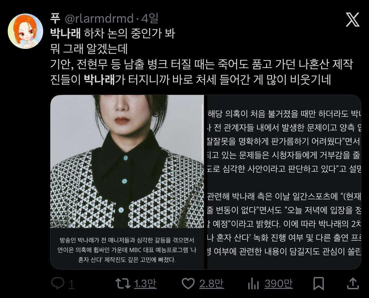 박나래 하차시키려는 MBC한테 개빡친 트위터 언냐