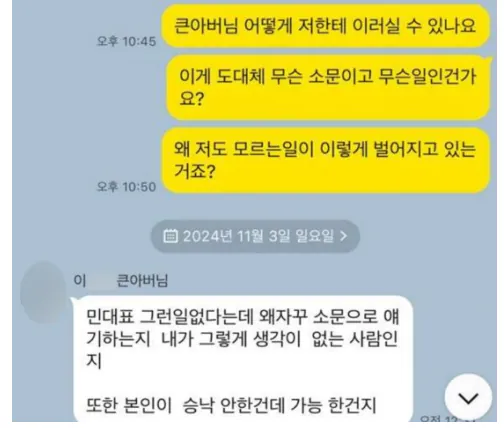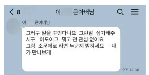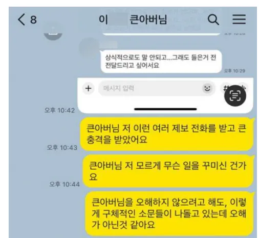 혜인 큰아버지와의 카톡 공개한 민희진 작성자 정보 sg원넓이 작성 작성일 2026.01.28 16:00 컨텐츠 정보 158 조회 목록 관리 글수정 글삭제 본문 이건 다른멤버 부모와의 대화 멤버 큰아버지라고 말하고 이름가려놨는데 뉴진스 멤버중에 이씨는 혜인밖에없음 관련자료 이전 쇼미더머니 영포티 작성일 2026.01.28 16:00 다음 강남 50평 아파트라도 시어머니 모시기 싫은 요즘 mz들.jpg 작성일 2026.01.28 15:00 댓글 0 등록된 댓글이 없습니다. 로그인한 회원만 댓글 등록이 가능합니다. 목록 관리 글수정 글삭제