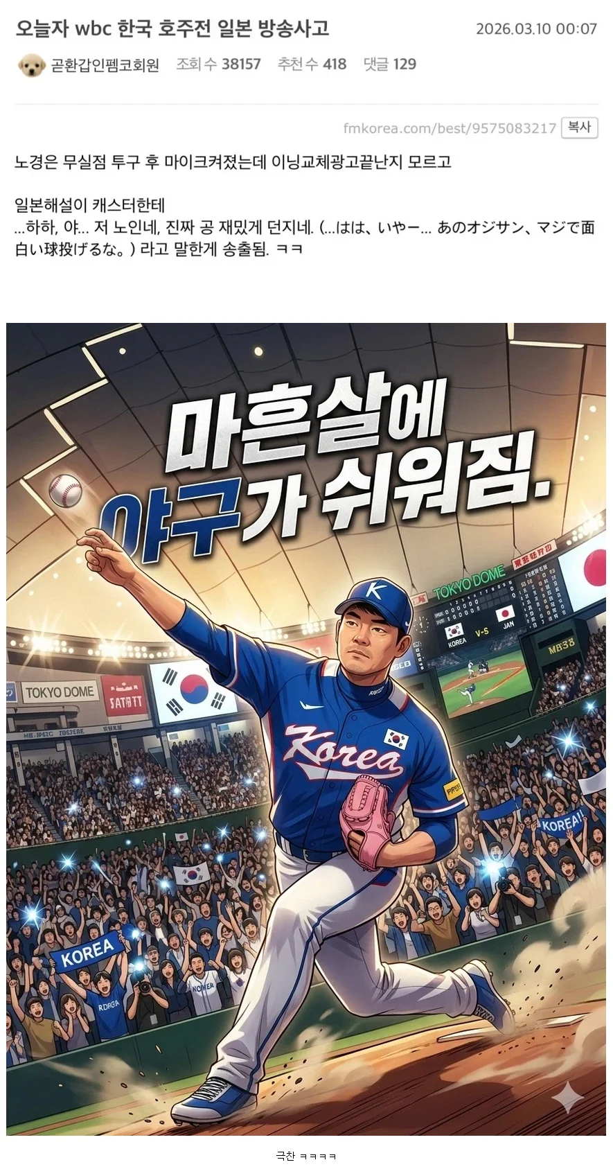 오늘자 일본 WBC 중계 방송사고 ㅋㅋㅋㅋ 작성자 정보 대추나무 작성 작성일 2026.03.10 17:00 컨텐츠 정보 183 조회 목록 관리 글수정 글삭제 본문 관련자료 이전 자신의 밈이 너무 많다는 이병헌 작성일 2026.03.10 17:00 다음 WBC 시청률은 패배했지만 화제성은 쓸어간 KBS 작성일 2026.03.10 17:00 댓글 0 등록된 댓글이 없습니다. 로그인한 회원만 댓글 등록이 가능합니다. 목록 관리 글수정 글삭제