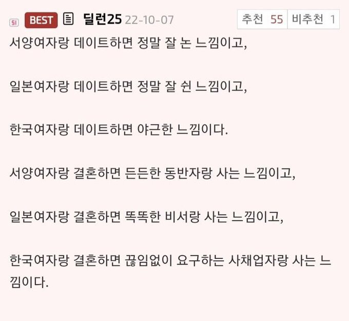 한국여자와 결혼에 대한 한국남자들의 평균적인 생각 작성자 정보 하마삼킨아유미 작성 작성일 2026.03.11 16:00 컨텐츠 정보 156 조회 목록 관리 글수정 글삭제 본문 관련자료 이전 한미일 껌피티니 스톤 작성일 2026.03.11 17:00 다음 미국 텍사스에서 샷건 쏘는 이서진 작성일 2026.03.11 16:00 댓글 0 등록된 댓글이 없습니다. 로그인한 회원만 댓글 등록이 가능합니다. 목록 관리 글수정 글삭제