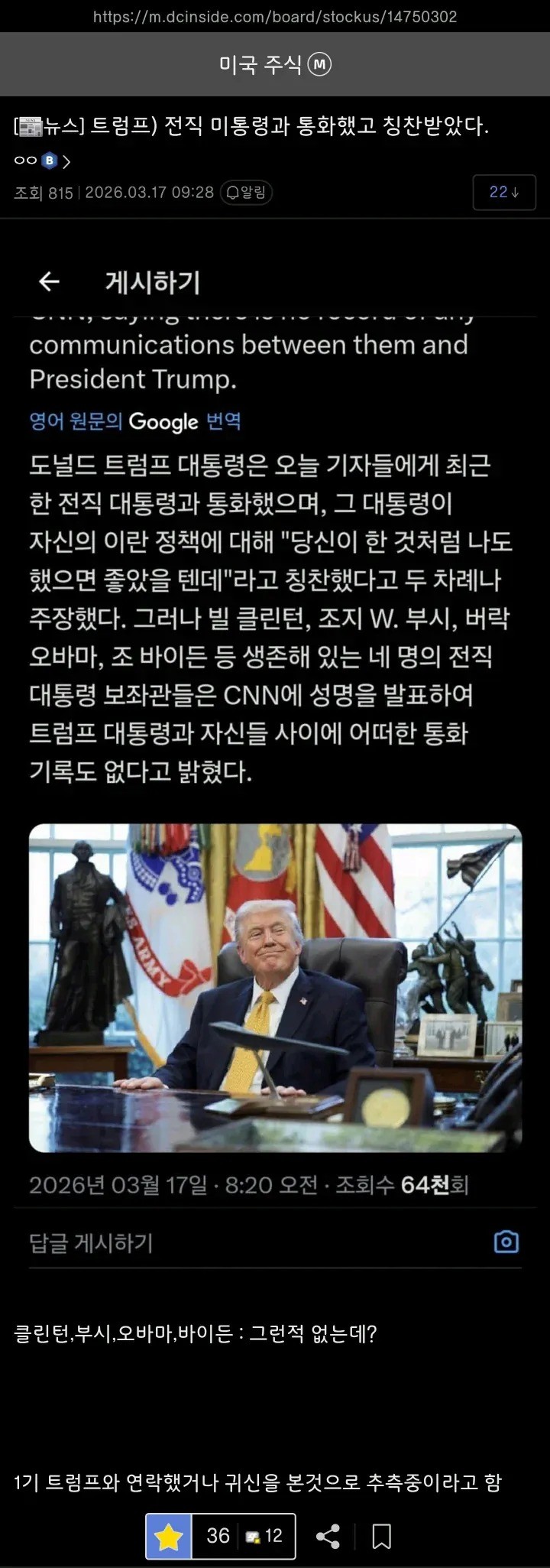 트럼프 근황 작성자 정보 빨간망든차차 작성 작성일 2026.03.17 16:00 컨텐츠 정보 162 조회 목록 관리 글수정 글삭제 본문 관련자료 이전 아내의 한마디로 우울증을 극복한 배우 작성일 2026.03.17 16:00 다음 마동석이 미국에서 빅사이즈가 아닌 이유 작성일 2026.03.17 15:00 댓글 0 등록된 댓글이 없습니다. 로그인한 회원만 댓글 등록이 가능합니다. 목록 관리 글수정 글삭제
