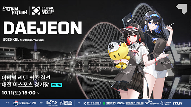 한편 ‘2025 KEL’은 올해 처음 출범한 지역 기반 이스포츠 리그로, 지역 선수 육성과 산업 활성화를 목표로 한다. 부산, 광주, 경남, 대전 등 지역 이스포츠 경기장과 협력해 오프라인 대회를 개최하며 지역 경제 활성화도 함께 도모한다. 문화체육관광부가 주최하고 한국e스포츠협회, 크래프톤, 님블뉴런, 넥슨코리아가 공동으로 주관하며, 이터널 리턴 최종 결선은 한국콘텐츠진흥원, 대전광역시, 대전정보문화산업진흥원, SK텔레콤, 꾸브라꼬 숯불치킨, MSI가 후원한다. 이터널 리턴 종목 총 상금은 5천만 원이다.