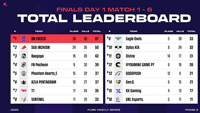 27일 서울 송파구 DN 아레나에서 진행된 '2025 펍지 위클리 시리즈 페이즈2' 파이널 1일차 경기에서 DN 프릭스가 97점으로 1위를 기록했고, 2치킨의 SGA가 50점으로 2위를 기록했다.