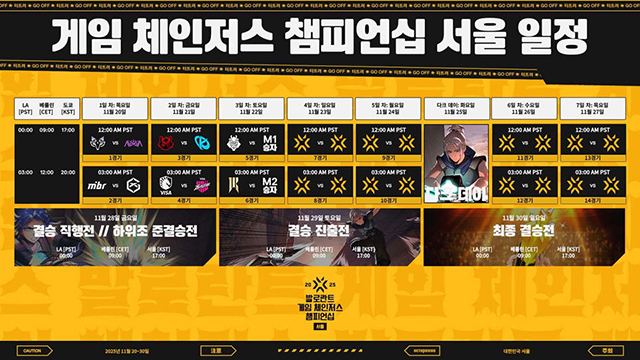 2025 발로란트 게임 체인저스 챔피언십은 LCK의 보금자리라고 할 수 있는 서울 종로에 위치한 롤파크에서 20일(목) 막을 올린다. 일주일 동안 펼쳐지는 3전 2선승제 더블 엘리미네이션 토너먼트에서 살아 남은 네 팀이 결승전 주말 경기에 임할 기회를 얻는다. 결승전 주말의 시작인 11월 28일(금)에는 결승 직행전과 하위조 준결승전 경기가 진행되고 11월 29일(토) 하위조 결승전, 11월 30일(일)에는 대망의 결승전이 펼쳐진다. 하위조 결승전과 최종 결승전은 5전 3선승제로 진행될 예정이다. 한국 대표 나인테일즈는 개막일인 20일(목) 중국의 노바 이스포츠 GC를 상대로 챔피언십 우승을 위한 첫 경기에 나선다.