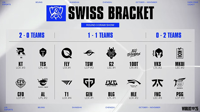 15일 중국 베이징 스마트 이스포츠 센터에서 열린 열린 '2025 리그 오브 레전드 월드 챔피언십(롤드컵)' 스위스 스테이지 2라운드 경기에서 KT 롤스터가 2승을, T1과 젠지 e스포츠가 패하며 1승 1패를, 첫 날 패했던 한화생명e스포츠는 뒤늦게 승리하며 역시 1승 1패를 기록했다.