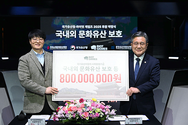 라이엇 게임즈는 지난 2일 서울 종로구 롤파크에 위치한 LCK 아레나에서 국가유산청과 ‘2025 국가유산지킴이 후원협약’을 맺고, 국외유산 환수와 국내 문화유산 보호 및 지원 등을 위해 8억 원을 후원했다고 밝혔다. 후원식에는 조혁진 라이엇 게임즈 한국 대표를 비롯해 허민 국가유산청장, 곽창용 국외소재문화유산재단 사무총장, 김영경 문화유산국민신탁 상임이사 직무대행 등이 참석했다.