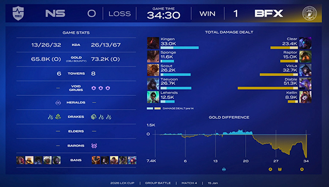 15일 서울 종로구 치지직 롤파크에서 열린 '2026 리그 오브 레전드 챔피언스 코리아' 컵 대회 그룹 대항전 2일차 2경기 1세트 블루 진영 농심 레드포스는 사이온-말파이트-탈리야-아펠리오스-카르마를, 레드 진영 BNK 피어엑스는 렉사이-노틸러스-아리-유나라-룰루를 선택했다.