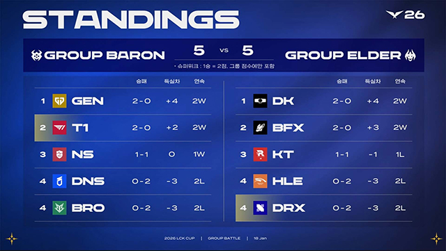그룹 대항전으로 진행되는 LCK컵 1주 차는 바론 그룹과 장로 그룹 모두 상위권이 빠르게 형성되며 초반 판도가 드러났다. 그룹 간 성적은 5승 5패로 균형을 이뤘다.